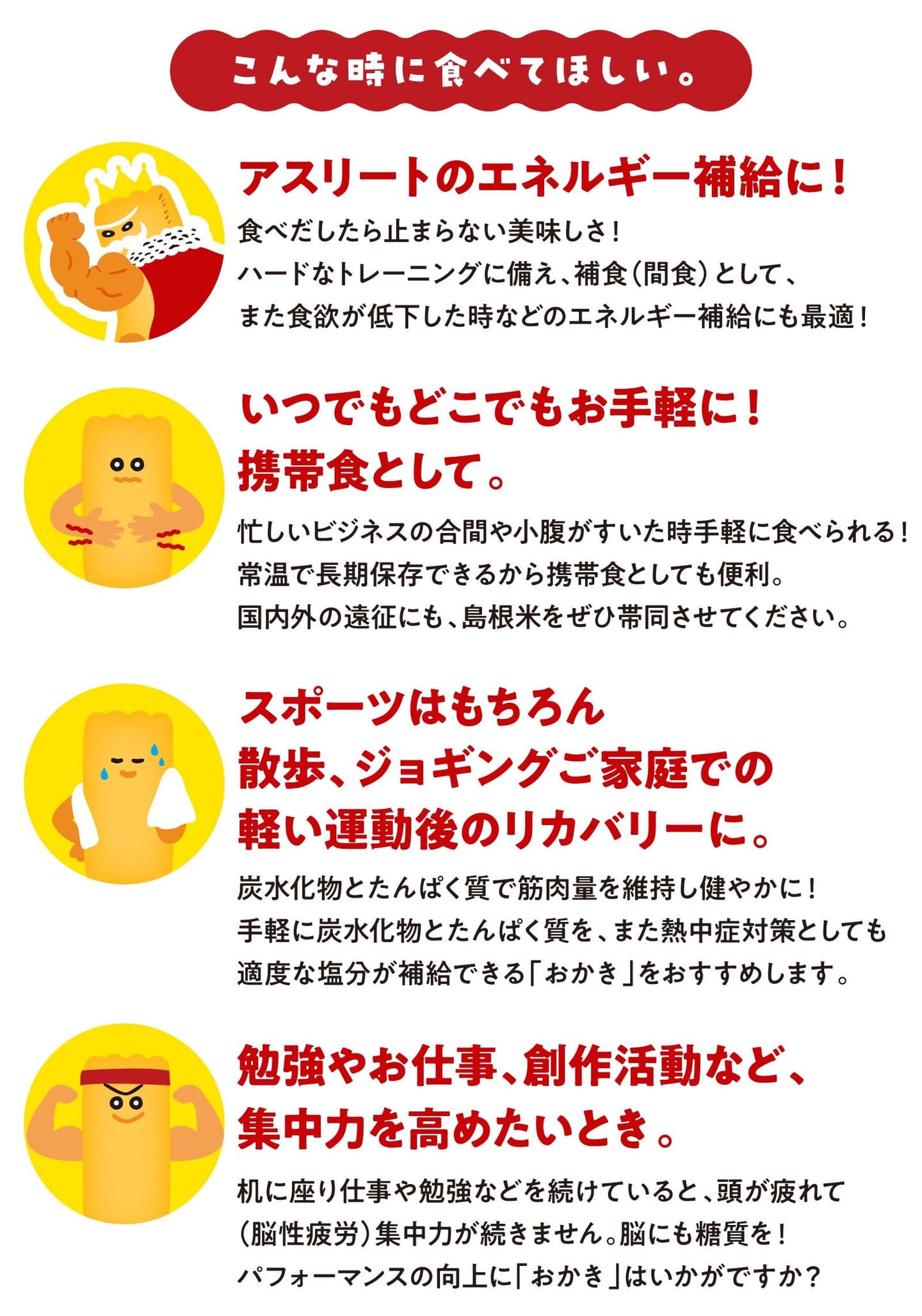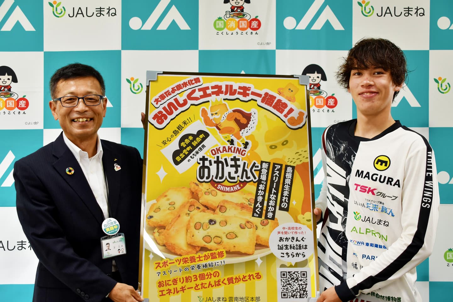 地元食材で安全性も高く、常温で長期保存でき軽く持ち運べるため、ホッケー日本代表となった選手たちは海外遠征時もしっかりとスーツケースへ。生産者から消費者までが地元「島根県」でつながる「地産地消」は県民の思いにも通じます。この「おかきんぐ」がアスリートの補食の一アイテムとして広く活用されるのであれば幸いに思います。
